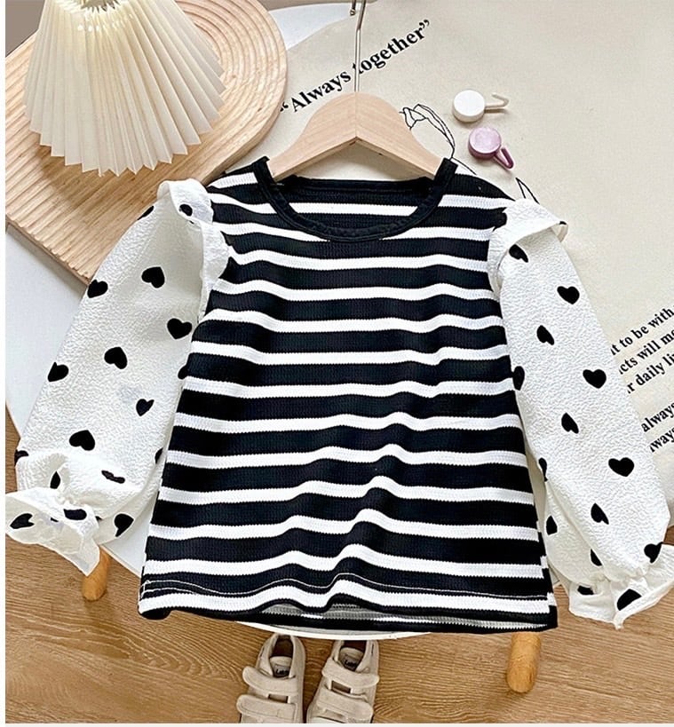 愛らしいボーダーとハート柄が特徴の長袖Tシャツです!カジュアルなデザインで、毎日のコーディネートに可愛さをプラス。お友達とのお出かけにもぴったりなアイテムです。