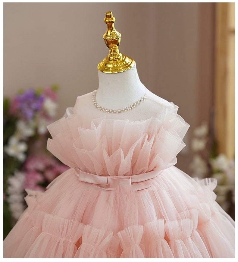 このドレスは、柔らかなミスティピンクの色合いと、エレガントなデザインが特徴です!特別なイベントやお祝いの日にふさわしい一枚で、着る人の可愛らしさを引き立てます。