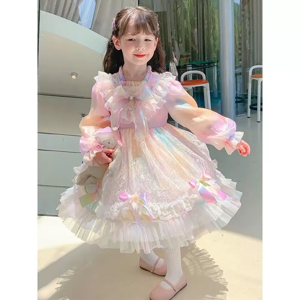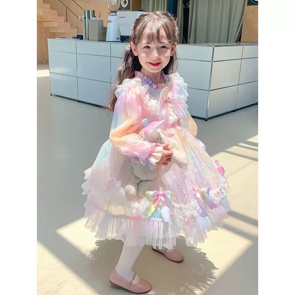 このワンピースは、鮮やかなレインボーリボンと柔らかな素材が特徴です!特別な日のお出かけやパーティーシーンにぴったりで、着るだけで楽しい気持ちにさせてくれます。フリルのデザインとふんわりとしたスカートが、動くたびに華やかな印象をもたらします。