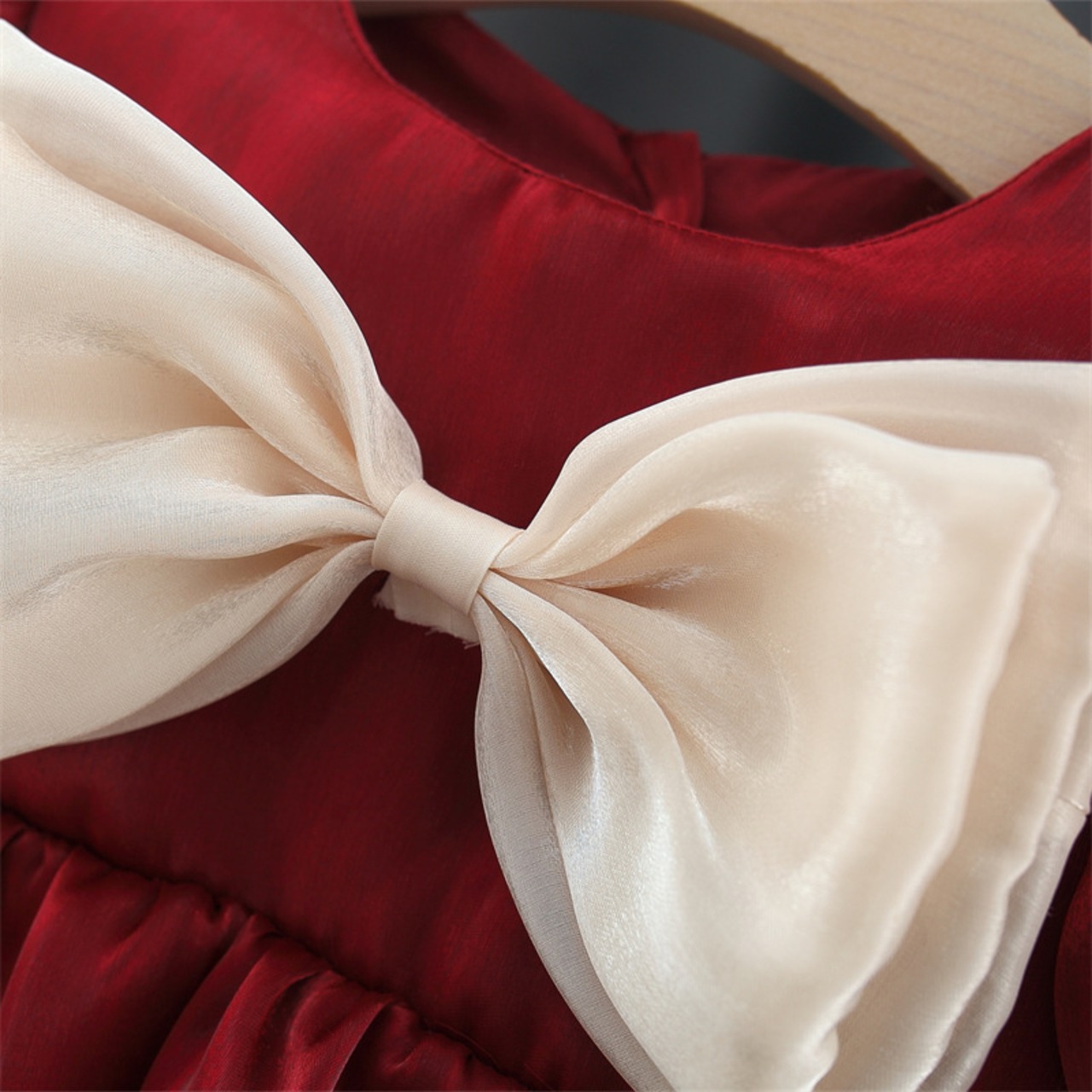 ビックリボンが印象的なワンピースが新登場しました!レッドとホワイトの鮮やかなカラーリングが、お子様の可愛らしさを引き立て、特別な瞬間を演出します。